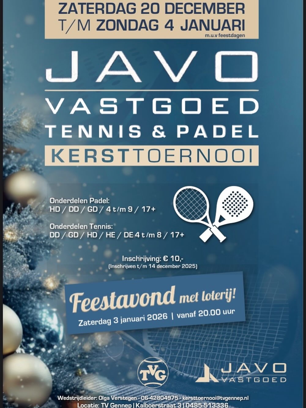TV Gennep organiseert weer hun jaarlijkse tennis en padel kerst toernooi. Deze vindt plaats van zaterdag 20 december t/m zondag 4 januari m.u.v de feestdagen. Wil je nog graag meedoen? Dan kun je je nog aanmelden t/m 14 december via mijnknltb.toernooi.nl