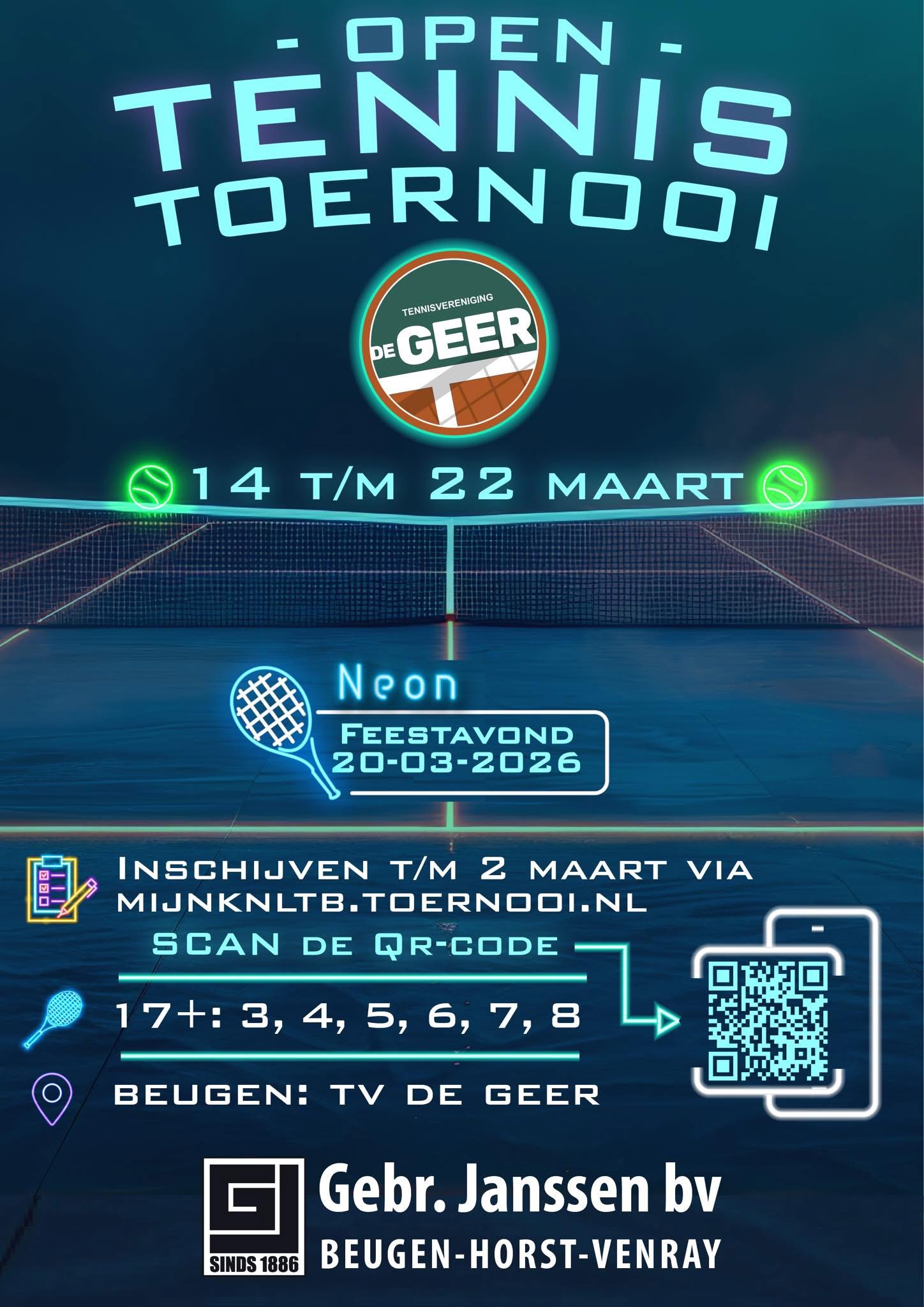 TV de Geer uit Beugen organiseert weer hun jaarlijkse lente toernooi. Van 14 t/m 22 maart kun je weer gezellig meedoen ter voorbereiding op de competitie.
