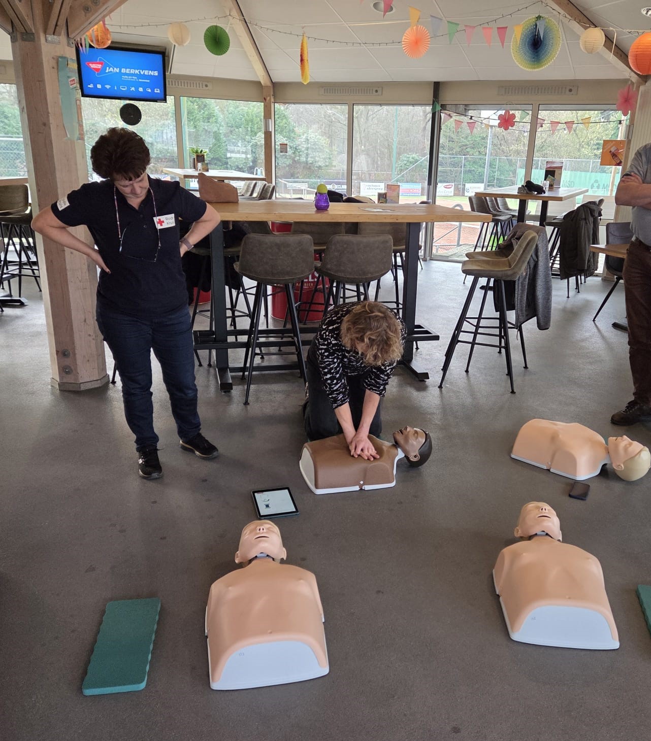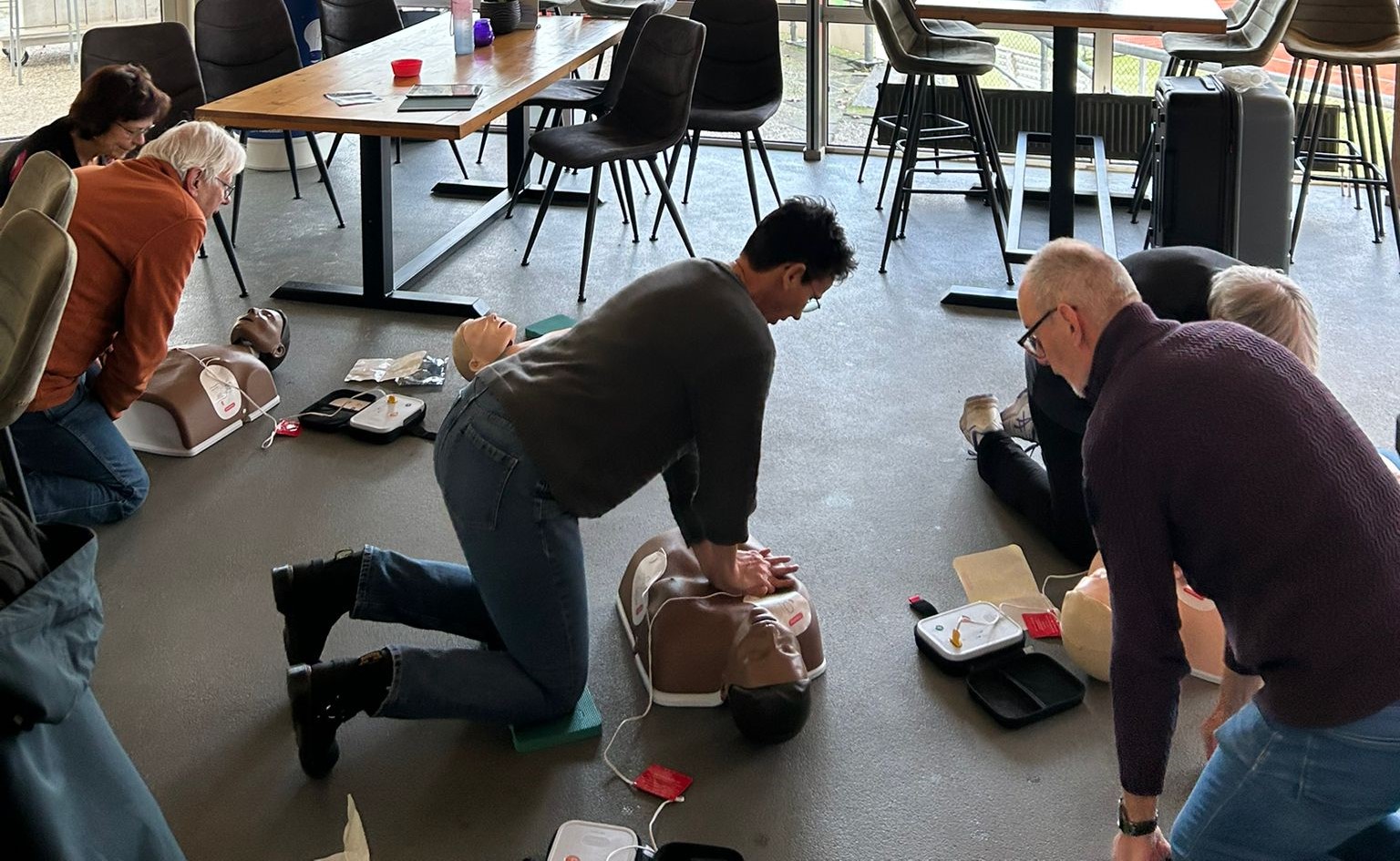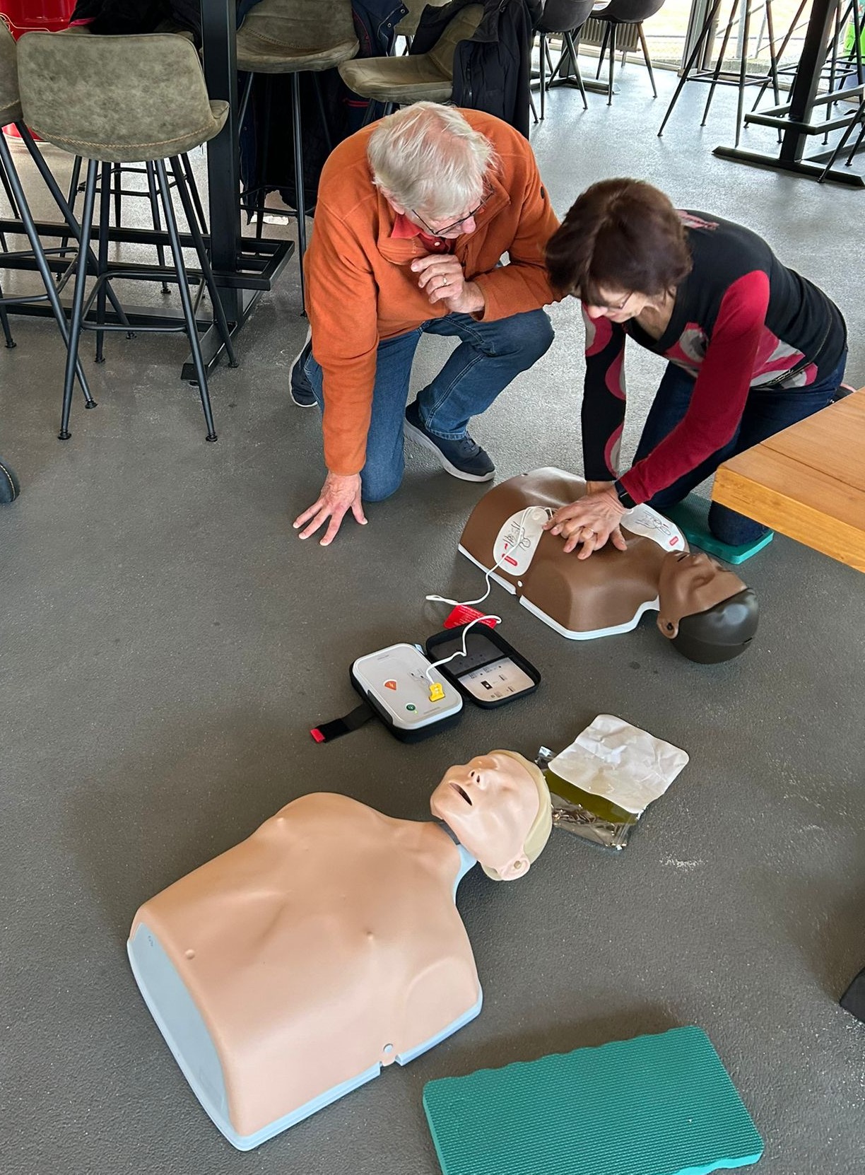 Mariel Linders leerde ons, om in geval van nood direct te kunnen beginnen met een reanimatie. Heel praktisch en voor iedereen te volgen nam zij ons in een paar uurtjes mee hoe een reanimatie werkt in de praktijk. Wat moet je doen, wat niet?Hoe werkt en bedien je de defibrillator? En dan zelf aan de slag!!