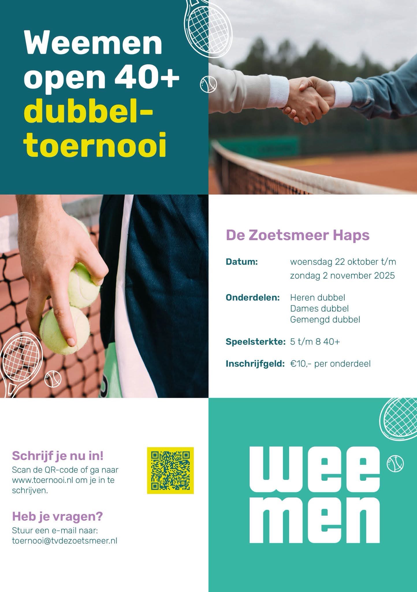 TV de Zoetsmeer in Haps organiseert een 40+ dubbel toernooi. Deze vindt plaats van woensdag 22 oktober t/m zondag 2 november. Inschrijven kan nog t/m 10 oktober 23.59 uur via mijnknltb.toernooi.nl